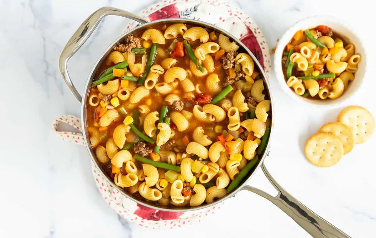 - ماکارونی و لوبیا سبز را به سوپ اضافه کنید و اجازه دهید تا سوپ به مدت ۵ تا ۷ دقیقه یا تا زمانی که ماکارونی کاملا پخته شود، روی حرارت بماند.